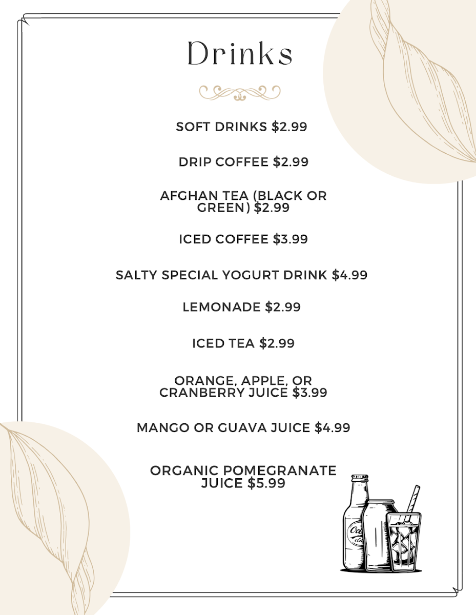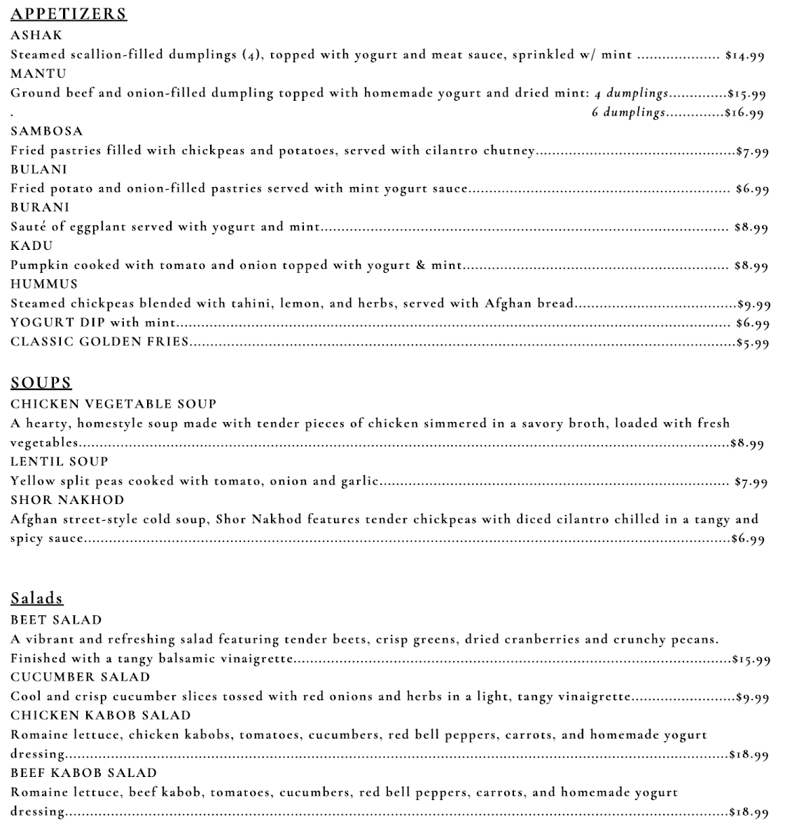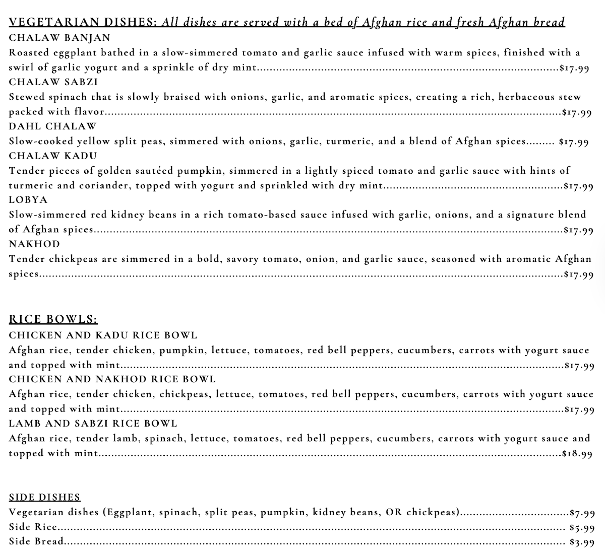Tender chunks of chicken or lamb cooked with onions, tomatoes, and spices served with Afghan rice, Afghan salad and Afghan bread.
