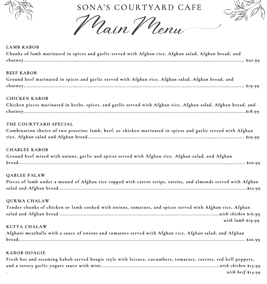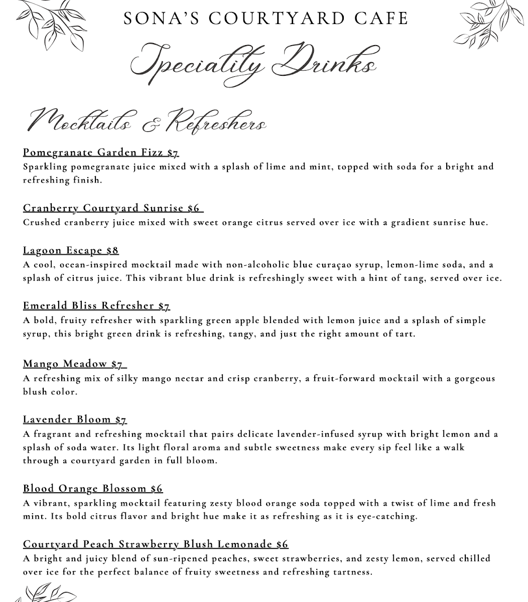 Sona’S Courtyard Restaurant And Cafe Menu gives off a cozy, inviting vibe the moment you walk into the spot at 70 Buckwalter Rd Unit 325, Royersford, PA. The menu feels like a relaxed journey through comfort food and global flavors, starting with small plates that pair perfectly with a casual coffee or a slow afternoon hangout. You’ll notice warm spices, fresh herbs, and grilled textures popping up dish after dish, which makes choosing just one favorite a challenge.